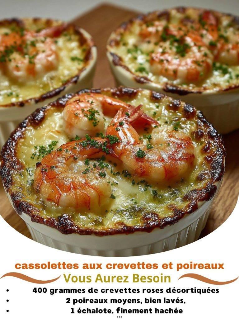 ces cassolettes aux crevettes et aux poireaux sont une invitation au plaisir gustatif délicat. elles allient la douceur fondante des poireaux à la délicatesse iodée des crevettes, le tout enveloppé dans une sauce crémeuse au vin blanc, gratinée sous une fine croûte de fromage dorée. ce plat, à la fois simple et élégant, convient parfaitement à un dîner convivial, à un repas familial ou à une entrée raffinée lors d’un événement spécial