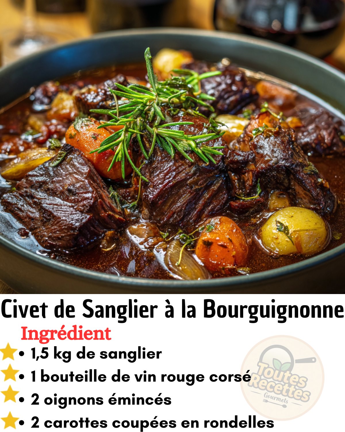 🇫🇷 Un grand classique de la cuisine française : une viande tendre et parfumée, longuement mijotée dans un vin rouge corsé avec des lardons, des oignons et des champignons 🍷🐗
