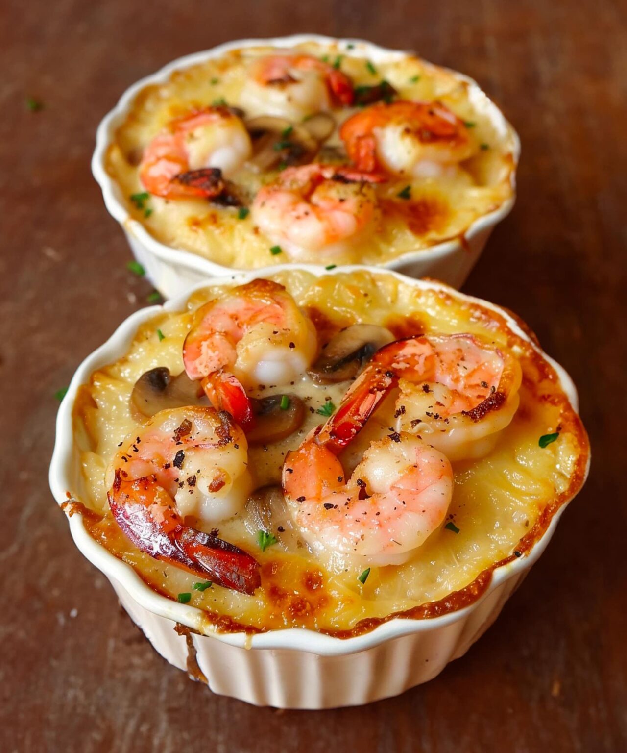 Les coquilles Saint-Jacques, trésors de la mer, s’harmonisent parfaitement avec la tendreté des crevettes et le parfum boisé des champignons. C’est un véritable équilibre entre terre et mer, souligné par une sauce qui enveloppe chaque ingrédient de tendreté. Ce plat est facile à préparer et délicatement présenté. Il convient à toutes les tables, aussi bien festives qu’intimistes.