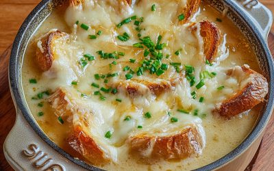 Soupe gratinée à l’oignon et au miso – croûtons dorés & fromage filant