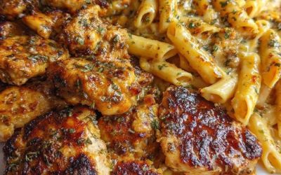 Poulet au beurre au cheddar, au parmesan et à l’ail avec des pâtes penne crémeuses
