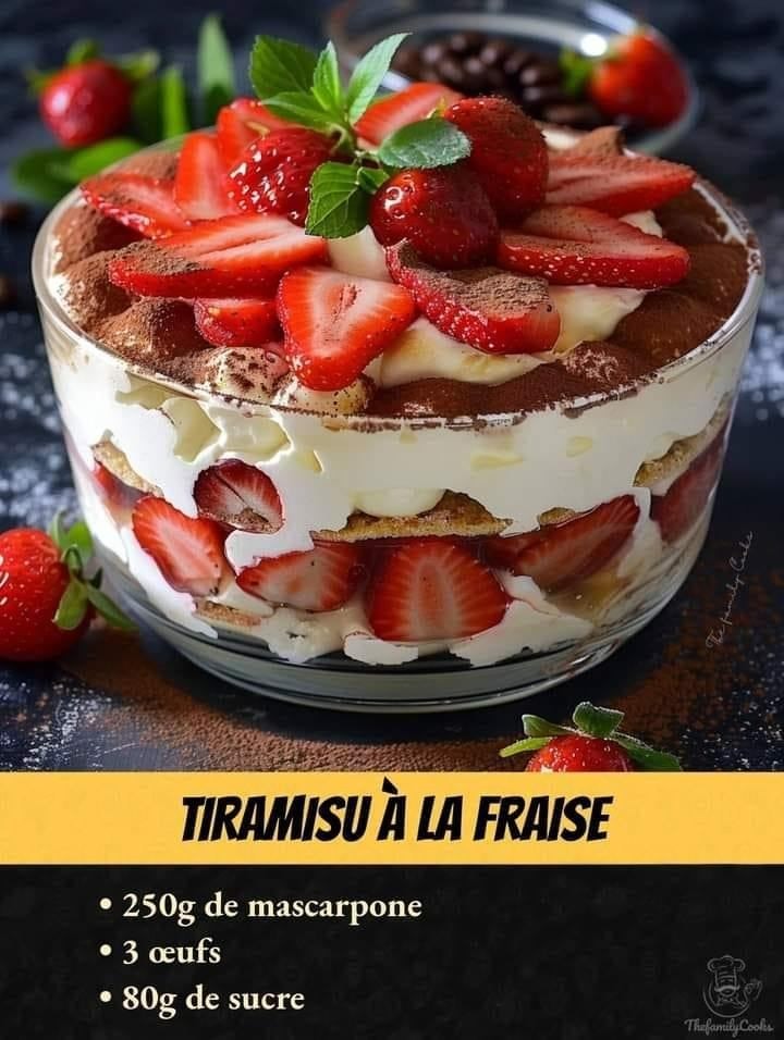 – 200 g de fraises coupées en tranches – Cuillère de biscuits – Poudre de cacao (pour saupoudrer)